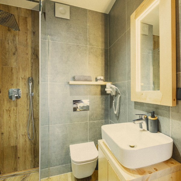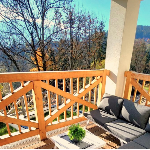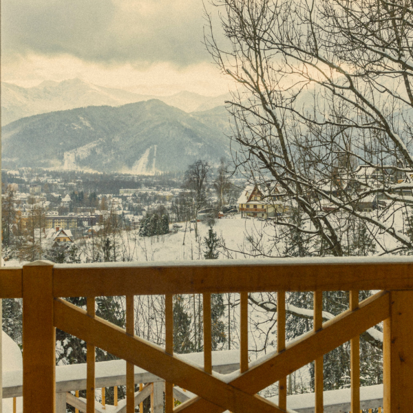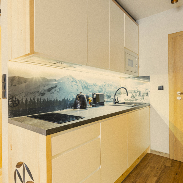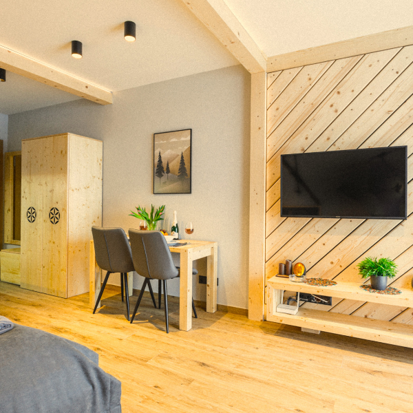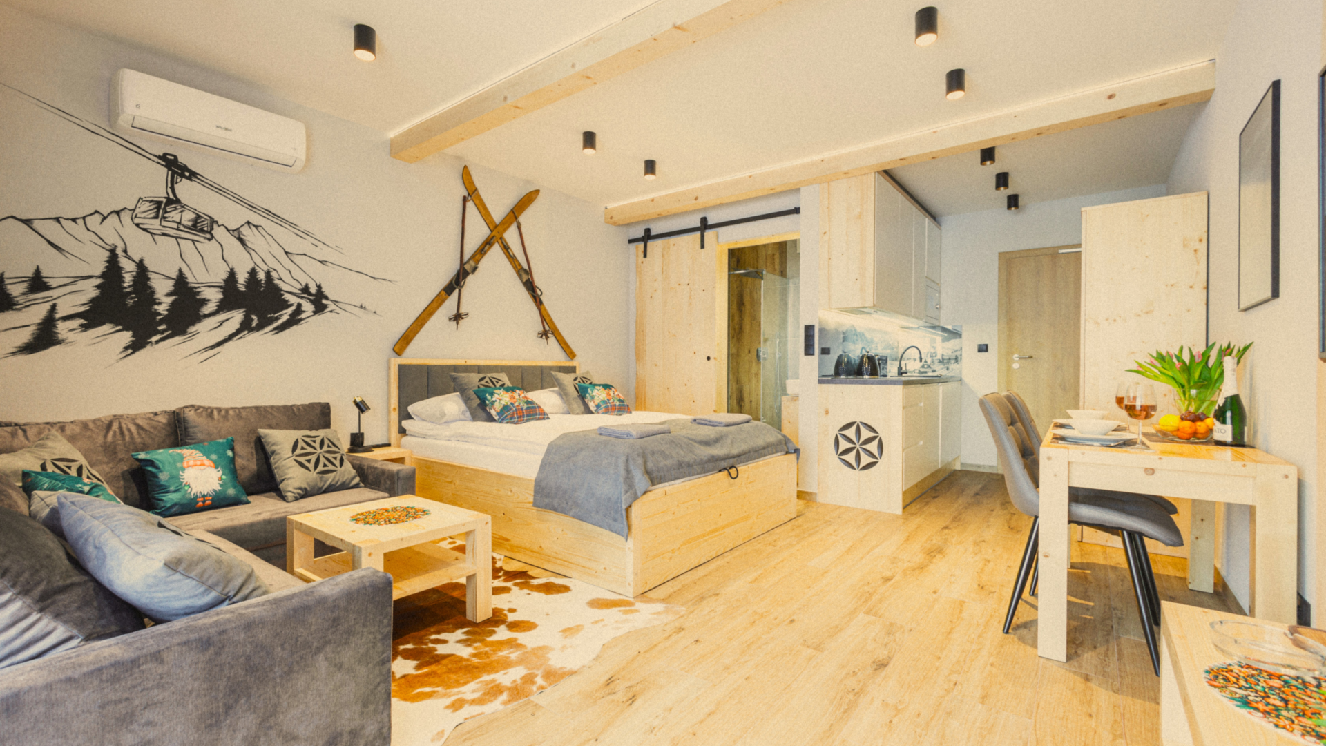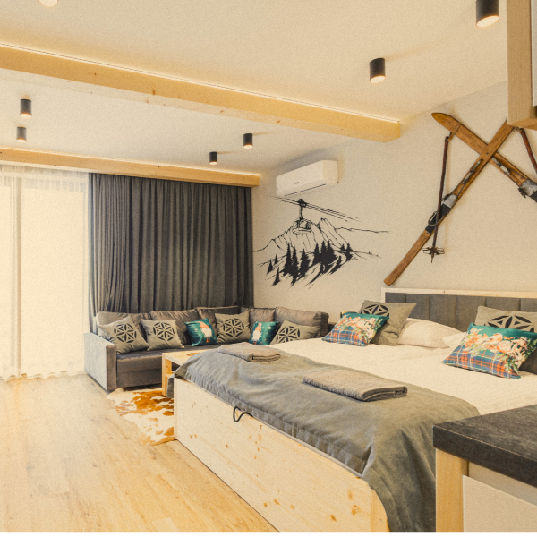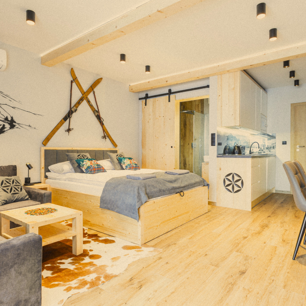 Ten apartament łączy tradycyjne, góralskie akcenty z nowoczesnym stylem – drewniane wykończenia, dekoracyjne narty nad łóżkiem oraz rysunek górskiego krajobrazu tworzą przytulną, regionalną atmosferę. Przeszklone drzwi balkonowe prowadzą na balkon z widokiem na góry, co dodaje wnętrzu wyjątkowego uroku.