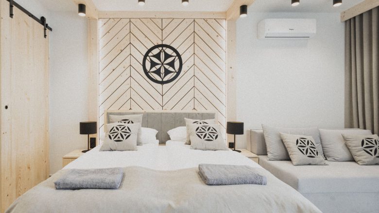 Apartament emanujący przytulnym, górskim klimatem, z dekoracjami inspirowanymi naturą i regionalnym wzornictwem. Ściana z motywem mglistych drzew tworzy spokojną, relaksującą atmosferę, a dodatki z futrzanymi poduszkami i wzorzystymi poduszkami dodają wnętrzu ciepła i charakteru.