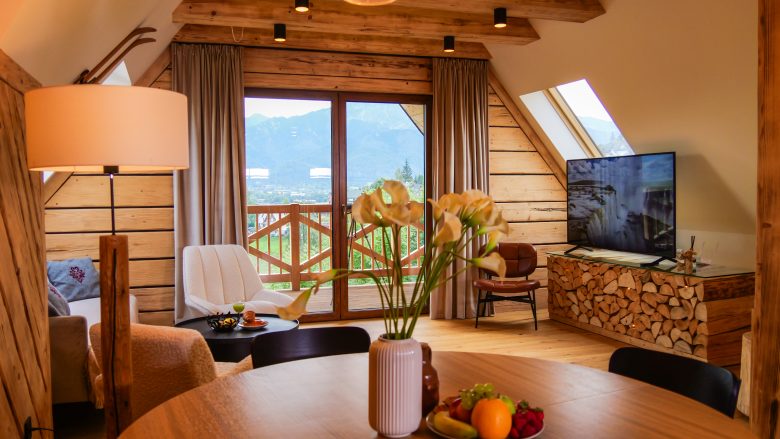Apartament oferuje przestronny salon z widokiem na Tatry, który zaprasza do relaksu w eleganckim, góralskim stylu. Wyposażony jest w dwie sypialnie, idealne do komfortowego wypoczynku, a drewniane wykończenia oraz duże okna potęgują poczucie bliskości z naturą.
