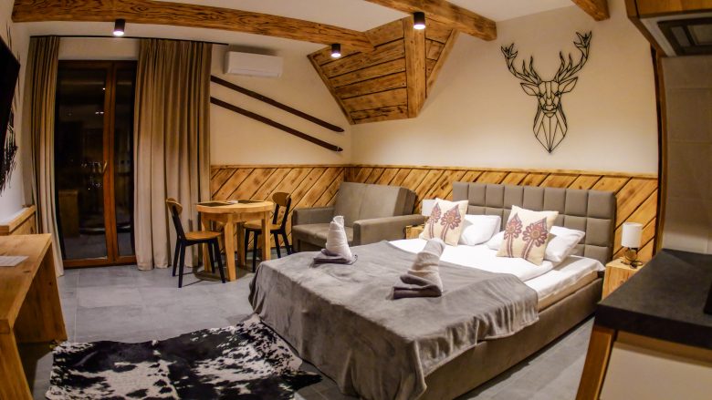 Apartament urządzony jest w stylu góralskim, z dominującymi drewnianymi akcentami i dekoracyjnymi detalami. W skład apartamentu wchodzi przytulny kącik wypoczynkowy, łóżko oraz stół, a także wyjście na balkon, z którego można podziwiać piękne górskie widoki.